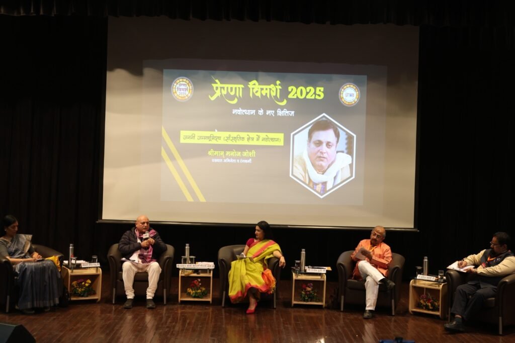 तीसरे सत्र में ‘सांस्कृतिक क्षेत्र में नवोत्थान’ विषय पर अभिनेता एवं रंगकर्मी मनोज जोशी ने कहा कि भारतीयता के मूल में आध्यात्म है। उन्होंने कहा कि अनेक आक्रांताओं ने भारत की संस्कृति को नष्ट करने का प्रयास किया, नालंदा जैसे विश्वविद्यालय जलाए गए, लेकिन श्रुति और स्मृति परंपरा के कारण ज्ञान सुरक्षित रहा।